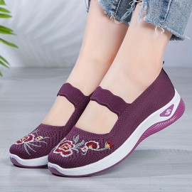 Women's Floral Embroidered Flats, Ankle Band Soft Sole Platform Shallow Mouth Shoes, Low-top Walking Comfy Shoes