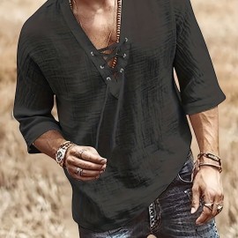 Men's Retro Shirt Top V Neck Lace Up Collar Middle Sleeves Closure Regular Fit Male Casual Shirt For Daily Beach Resorts Summer