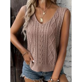 Plus Size Solid Cut Out Knitted Top, Casual Crew Neck Sleeveless Top, Women's Plus Size Clothing