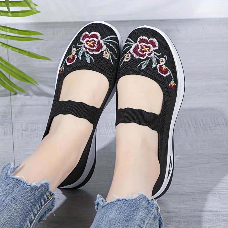 Women's Floral Embroidered Flats, Ankle Band Soft Sole Platform Shallow Mouth Shoes, Low-top Walking Comfy Shoes